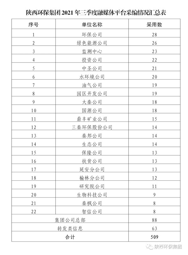 为加强集团公司门户网站、微信公众号、新浪微博等融媒体平台的稿件采编工作,鼓励广大通讯员围绕企业中心工作撰写出高质量的稿件,发挥优秀稿件的示范作用,为集团高质量发展鼓与呼,按照集团公司《关于建立政务信息采用情况通报和优秀稿件评选制度的通知》(陕环司函〔2021〕31号)文件要求,现将2021年三季度集团公司融媒体平台稿件采用及优秀稿件评选情况通报如下:
