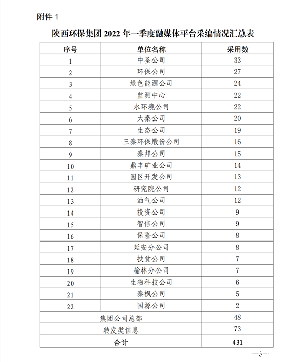 为进一步提高集团融媒体平台稿件的质量与水平,有效发挥融媒体平台服务企业高质量发展的作用,传播时代精神,讲好集团故事,按照集团公司《关于建立政务信息采用情况通报和优秀稿件评选制度的通知》(陕环司函〔2021〕31号)文件要求,现将2022年一季度集团公司融媒体平台稿件采用及优秀稿件评选情况通报如下: