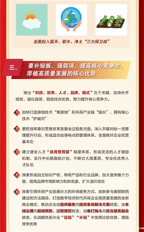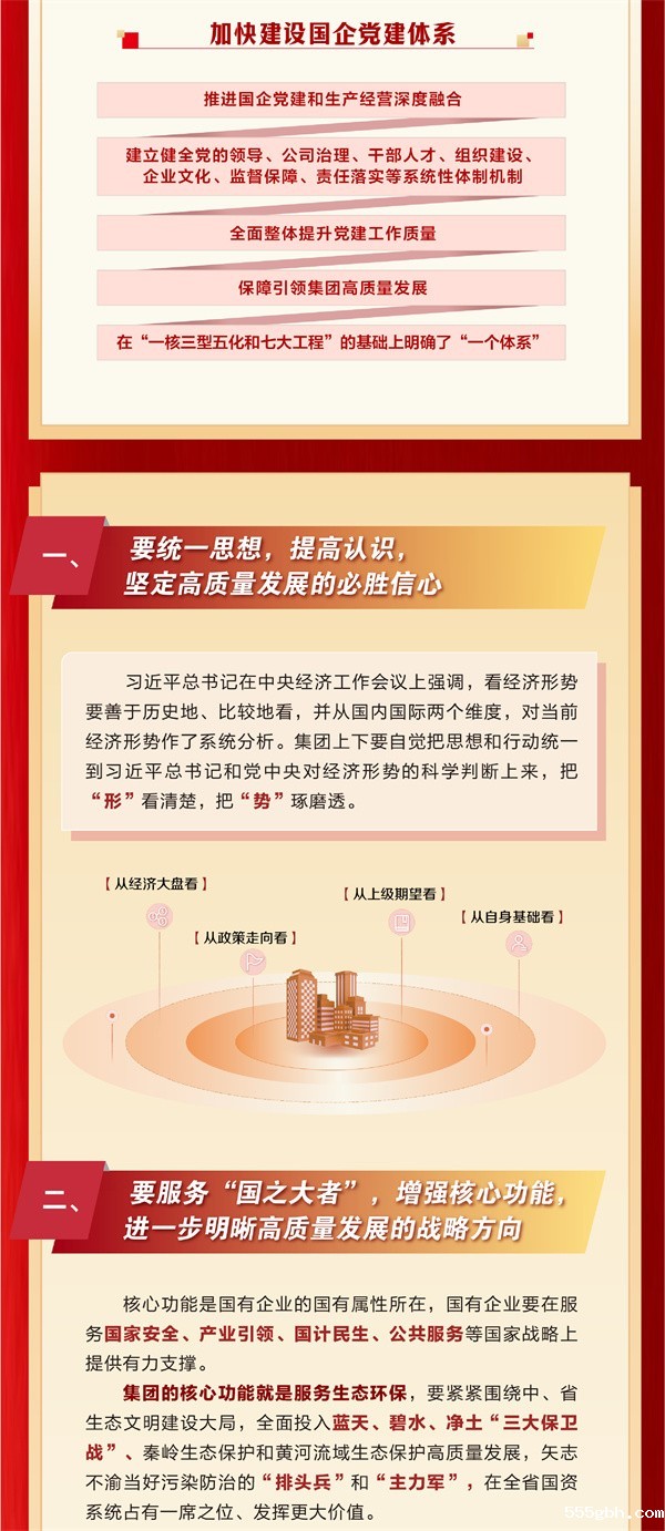就进一步做好集团2024年工作,郝军亮提出五个方面意见:一是统一思想,提高认识,坚定高质量发展的必胜信心。要正视困难、直面问题,坚定信心、保持定力,大幅化解存量问题,有效遏制增量问题,全面提高合规管理水平,促进稳健经营,推动高质量发展。二是服务“国之大者”,增强核心功能,进一步明晰高质量发展的战略方向。要聚焦“服务生态环保”这一核心功能,紧紧围绕中、省生态文明建设大局,全面投入蓝天、碧水、净土“三大保卫战”、秦岭生态保护、黄河流域生态保护和高质量发展,矢志不渝当好污染防治的“排头兵”和“主力军”,在全省国资系统占有一席之位、发挥更大价值。三是补短板、强弱项,提高核心竞争力,厚植高质量发展的核心优势。要突出“科技、效率、人才、品牌、模式”五个关键,加快补齐短板、强化弱项、锻造综合优势,努力提升核心竞争力。四是强化管理,提升效益,筑牢高质量发展的坚实根基。要把“稳增长”作为首要目标,把“强管控”作为重要举措,把“推改革”作为有力抓手,把“促创新”作为动力引擎,把“防风险”作为关键环节,把“保安全”作为底线要求。五是坚持党的领导,加强党的建设,强化高质量发展的政治保障。要通过加强党的政治建设,推进党建与生产经营深度融合,强化基层党组织建设,加快kaiyun体育官网平台入口建设,培养过硬干部人才队伍,深入推进党风廉政建设和反腐败工作等举措,服务保障党中央重大决策部署和省委、省政府工作要求在集团落实落地,以实干实绩拥护“两个确立”、做到“两个维护”。