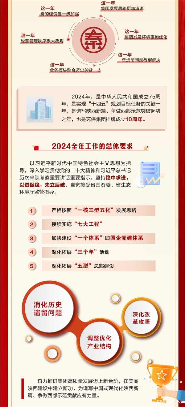 郝军亮强调,2024年是中华人民共和国成立75周年,是实现“十四五”规划目标任务的关键一年,是谱写陕西新篇、争做西部示范突破起势之年,也是环保集团挂牌成立10周年。全年工作的总体要求是:以习近平新时代中国特色社会主义思想为指导,深入学习贯彻党的二十大精神和习近平总书记来陕考察重要讲话重要指示,坚持稳中求进,以进促稳,先立后破,自觉接受省国资委、省生态环境厅监管指导,持续坚持“一核三型五化”,接续实施“七大工程”,加快建设国企党建“一个体系”的“13571”发展思路,深化拓展“三个年”活动和“五型”总部建设,下大力气消化历史遗留问题、调整优化产业结构、深化改革攻坚,奋力推进集团高质量发展迈上新台阶,在陕西生态文明建设中再立新功,为谱写中国式现代化陕西新篇、争做西部示范贡献应有力量。