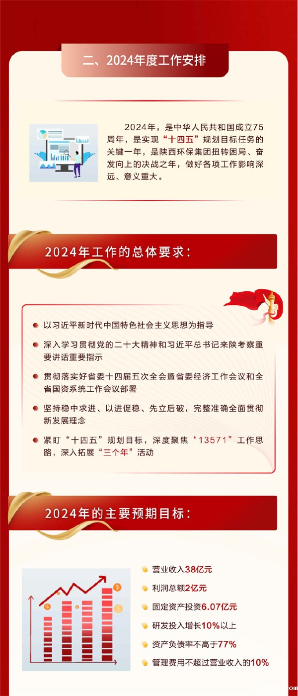 报告从“顶层设计、市场拓展、项目建设、国企改革、科技创新、内部管控”六个方面全面总结2023年工作成效,客观分析了当前存在的问题,并提出2024年工作重点:坚持稳中求进、以进促稳、先立后破的工作导向,深度聚焦“13571”发展思路,推动集团增强核心功能、提高核心竞争力,加快建成国内一流环保企业,为改善区域生态环境、助推环保产业发展、谱写中国式现代化建设的陕西新篇章作出更大贡献。2024年主要经营目标是:全年实现营业收入38亿元,利润总额2亿元,固定资产投资6.07亿元,研发投入增长10%以上,资产负债率不高于77%,管理费用不超过营业收入的10%。