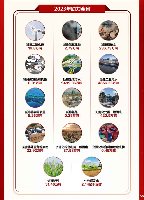 全年助力全省减排二氧化硫19.8万吨、氮氧化物2.79万吨、烟粉尘236.73万吨、挥发性有机物0.91万吨;处理生活污水9499.36万吨、工业污水4856.23万吨,减排化学需氧量5.26万吨、氨氮0.25万吨;无害化处置一般固废420.9万吨、危险废物22.92万吨;资源化综合利用一般固废37.98万吨、危险废物0.49万吨;处理秸秆31.46万吨,生物质发电2.13亿千瓦时,为全省打赢污染防治攻坚战发挥了“排头兵”“主力军”作用。