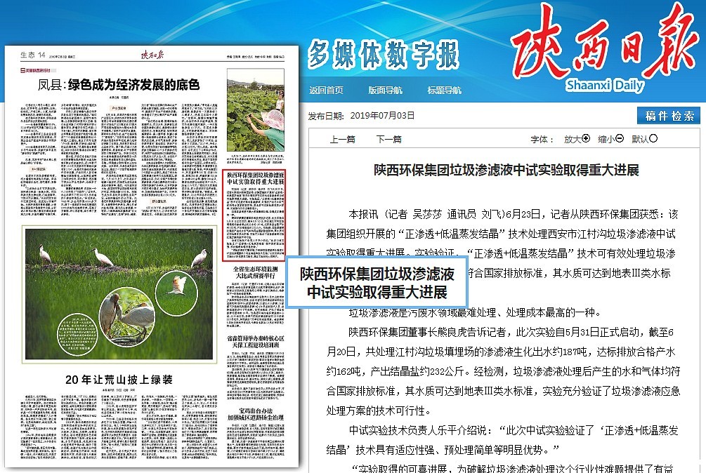 陕西日报:kaiyun彩票官网垃圾渗滤液中试实验取得重大进展