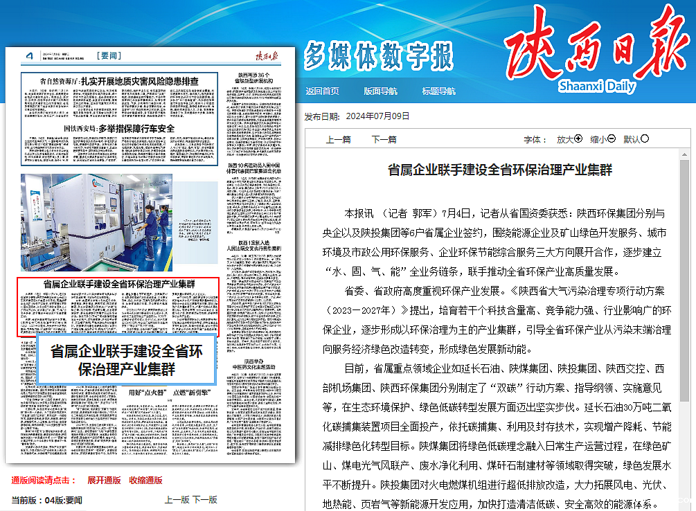7月9日,陕西日报以《省属企业联手建设全省环保治理产业集群》为题,对kaiyun彩票官网举办陕西国企生态环保业务合作座谈会和服务全省环保产业链发展等情况进行了报道。现刊载如下,以飨读者。