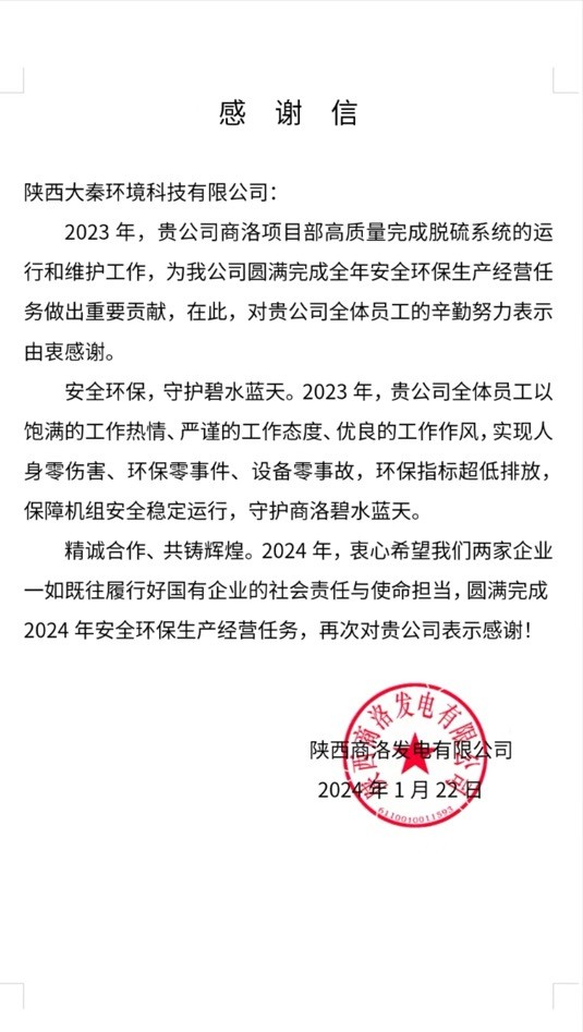 近日,大秦公司收到陕投集团商洛发电公司感谢信,来信充分肯定大秦商洛项目公司在2023年高质量完成脱硫系统的运行和维护工作,为商洛发电公司圆满完成全年安全环保生产经营任务作出了重要贡献。同时,商洛项目公司荣获商洛发电公司2023年度“安全先进集体”荣誉。