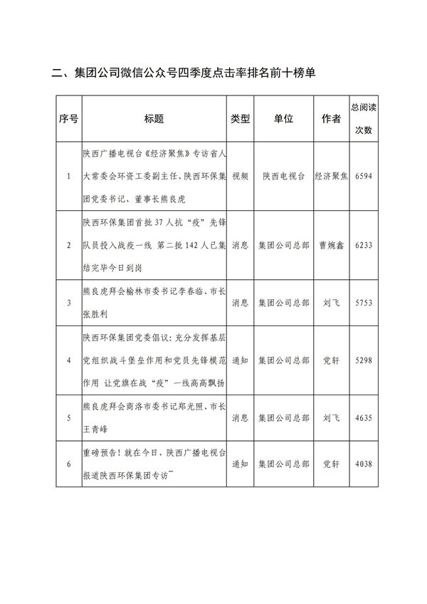 为加强集团公司门户网站、微信公众号、新浪微博、视频号等融媒体平台的稿件采编工作,鼓励广大通讯员围绕企业中心工作撰写出高质量的稿件,发挥优秀稿件的示范作用,为集团高质量发展鼓与呼,按照集团公司《关于建立政务信息采用情况通报和优秀稿件评选制度的通知》(陕环司函〔2021〕31号)文件要求,现将2021年度集团公司融媒体平台稿件采用及2021年四季度优秀稿件评选情况通报如下: